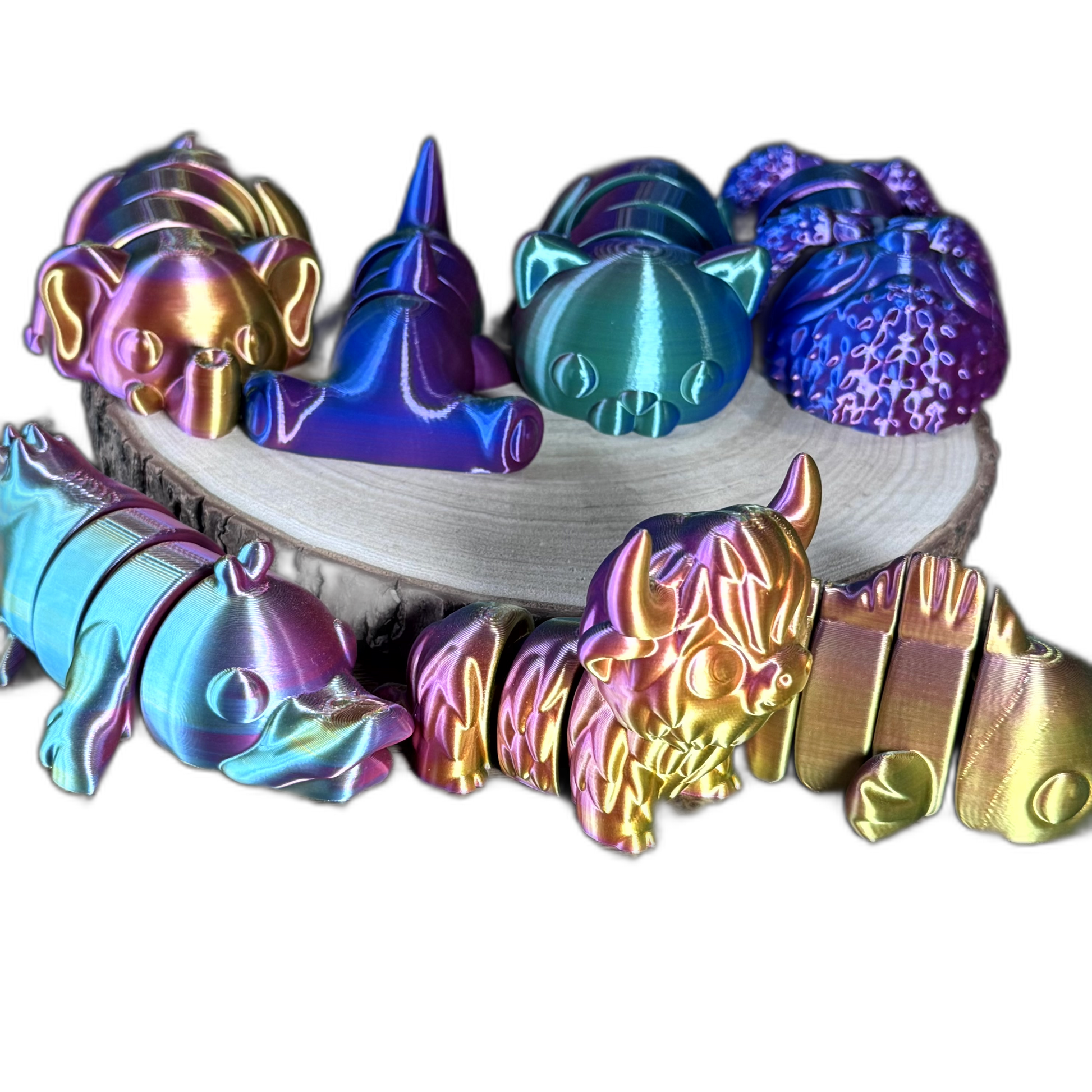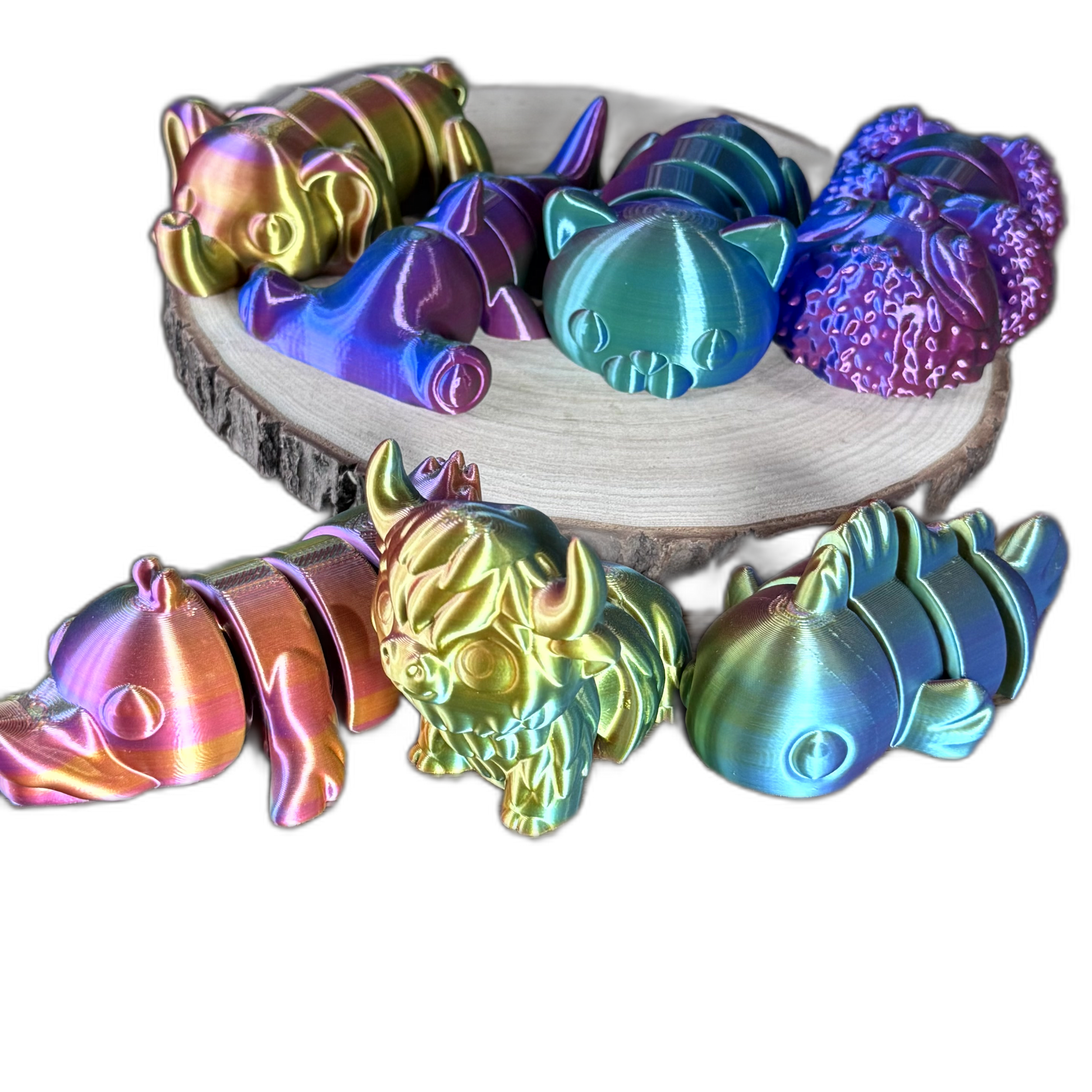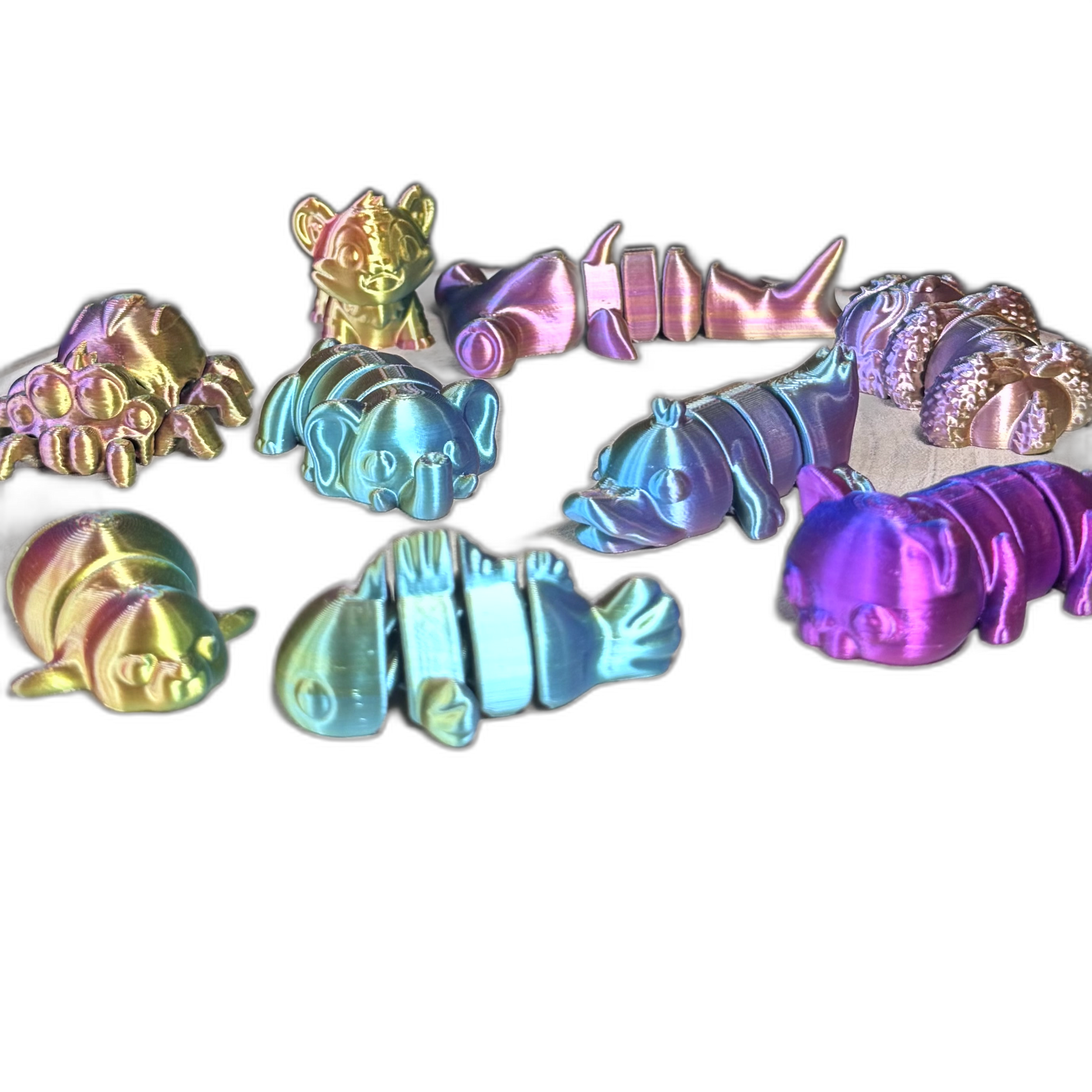 Brighten your day with our Articulated 3D Printed Mini Creatures, a colorful collection of fun, fidget-friendly animal designs. Each piece features smooth, flexible articulation and is crafted from stunning iridescent PLA, bringing vibrant personality to your desk, shelf, or sensory play collection.