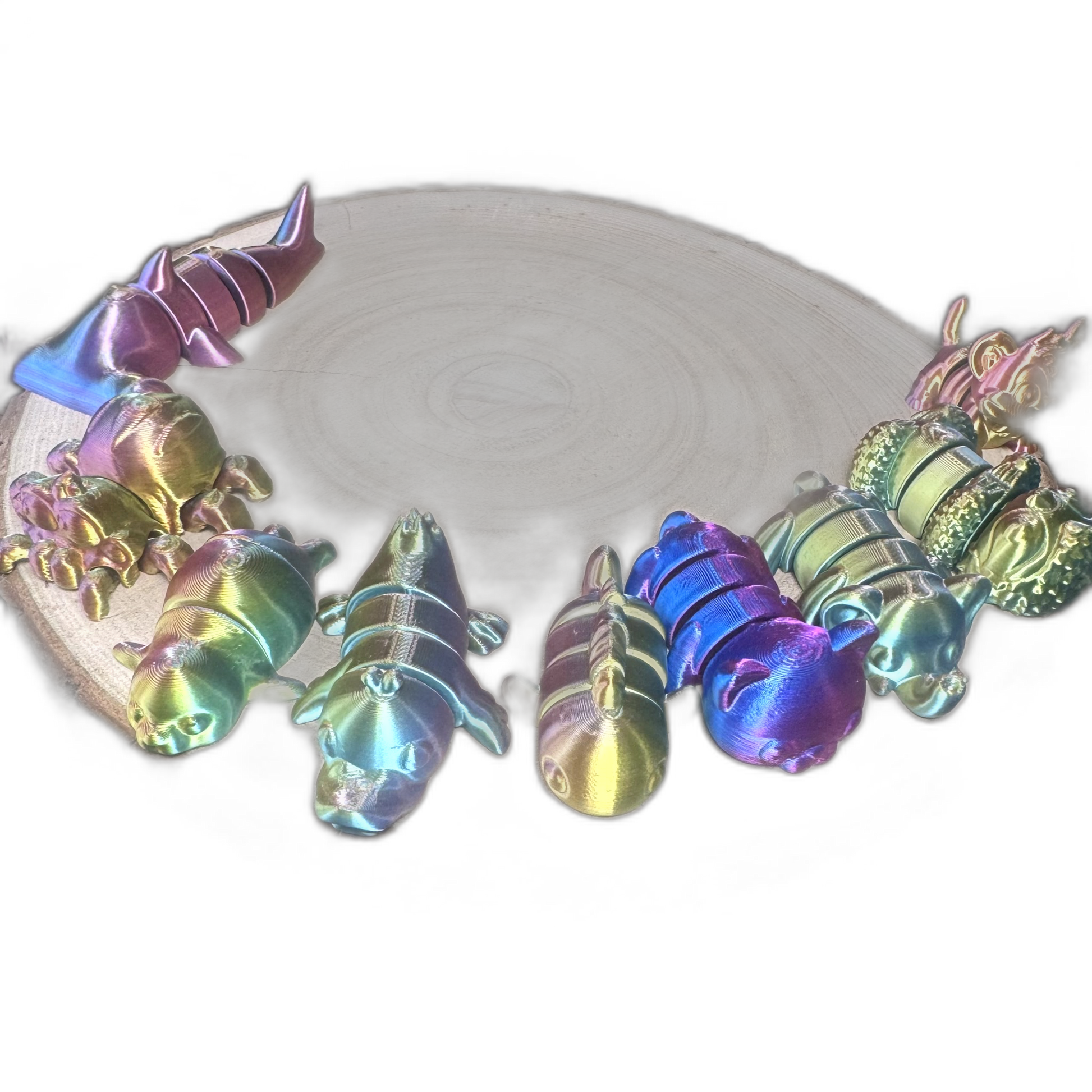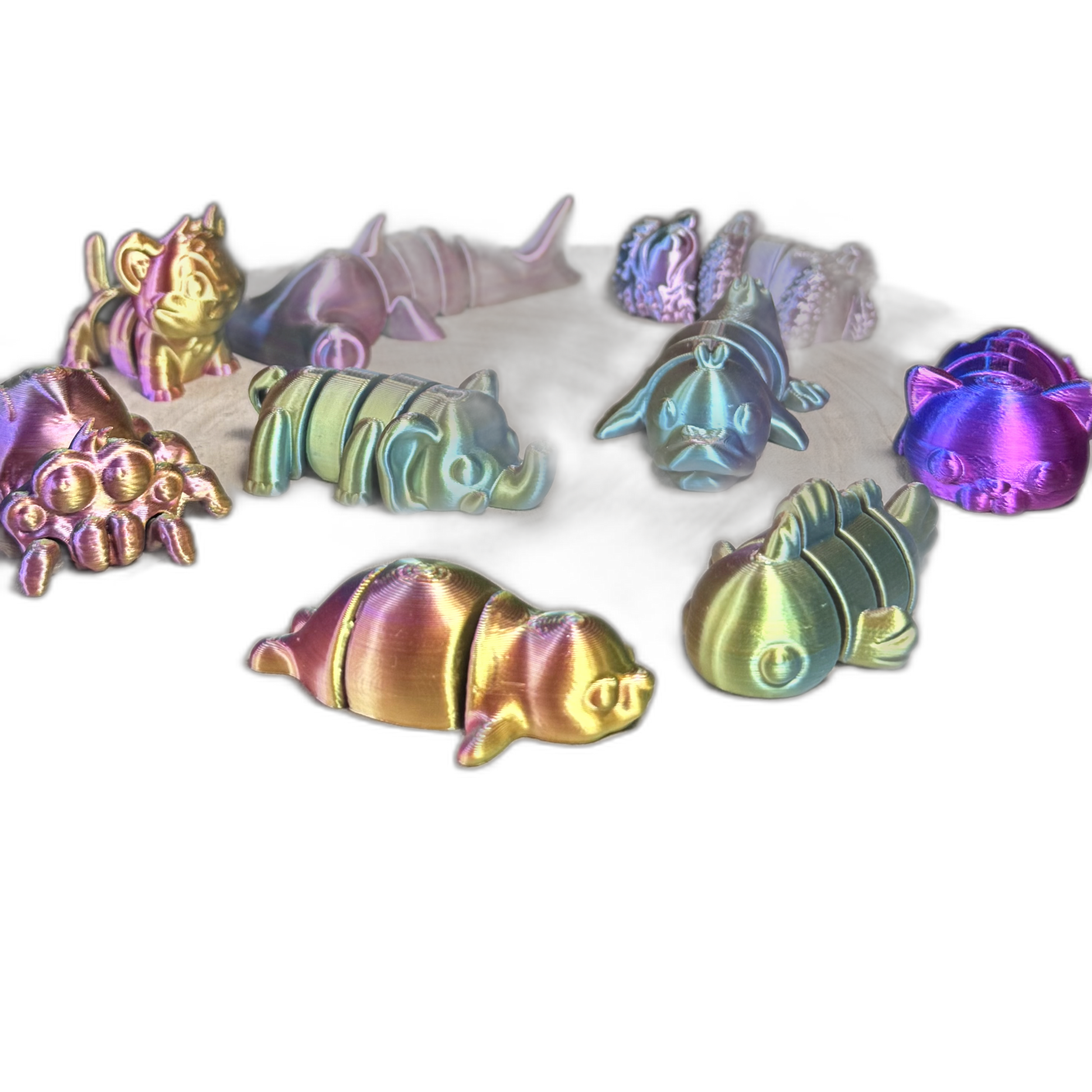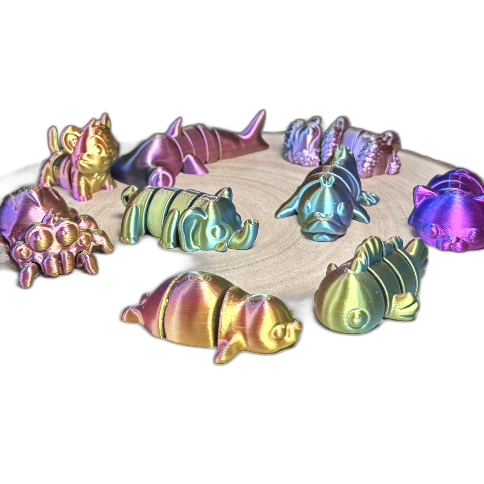 Brighten your day with our Articulated 3D Printed Mini Creatures, a colorful collection of fun, fidget-friendly animal designs. Each piece features smooth, flexible articulation and is crafted from stunning iridescent PLA, bringing vibrant personality to your desk, shelf, or sensory play collection.